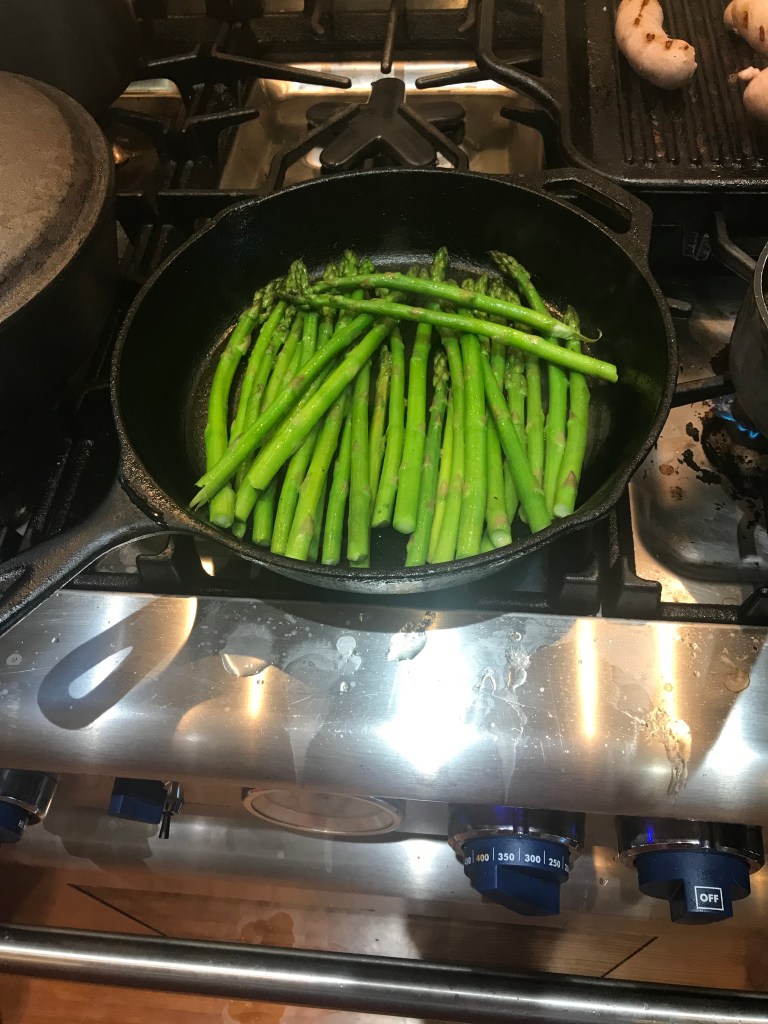 For the asparagus, a simple cooking on the stove top was done to prepare the veggies, as my family was getting hungry! Below is a picture of the asparagus on the stove. The white sauce was forgone, as time was running out. Instead, the asparagus was seasoned with salt, pepper, and a dash of garlic powder.
