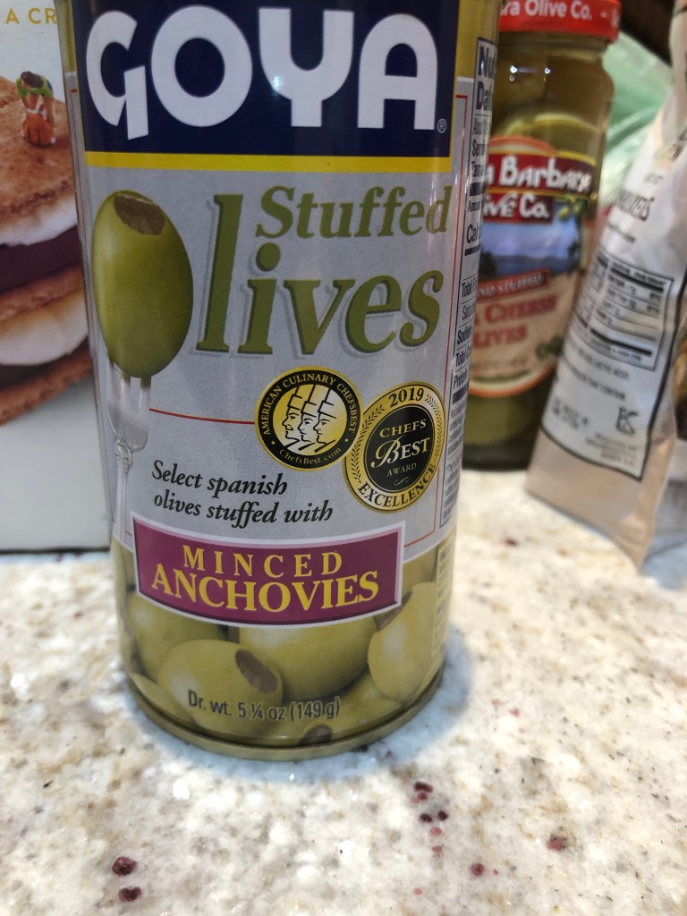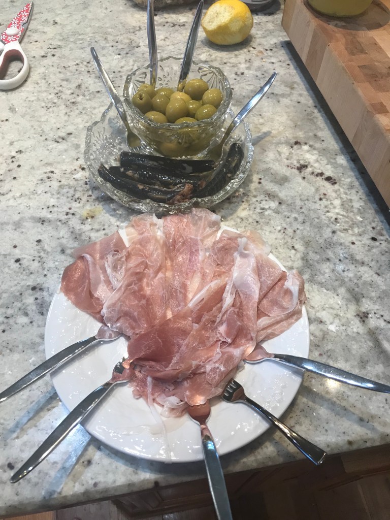 Anchovies, Galician ham, and olives seemed to be appetizers that were plated as they would have been bought from a distributer. The anchovies were taken from a tin, the Galician ham from the deli, and the olives from a can. I actually chose to use anchovies stuffed olives for the appetizers, but had to switch to Feta filled olives at dinner, as my lovely sister had eaten all the anchovies stuffed ones before dinner had been served. Here is what the plated simple appetizers looked like.