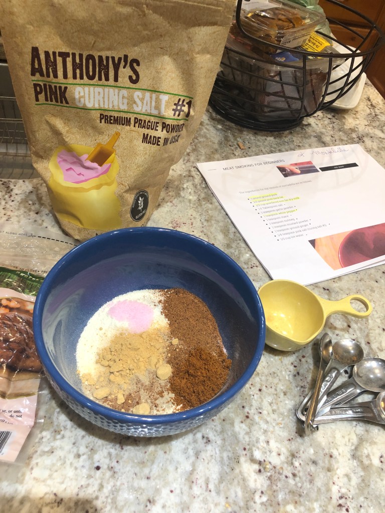 I then combined wet ingredients in a bowl and then into the freezer, and dry seasonings in another. The key here was the pink curing salt, which really gives the mortadella a chance to marinate inside of the stomach lining casings once stuffed.