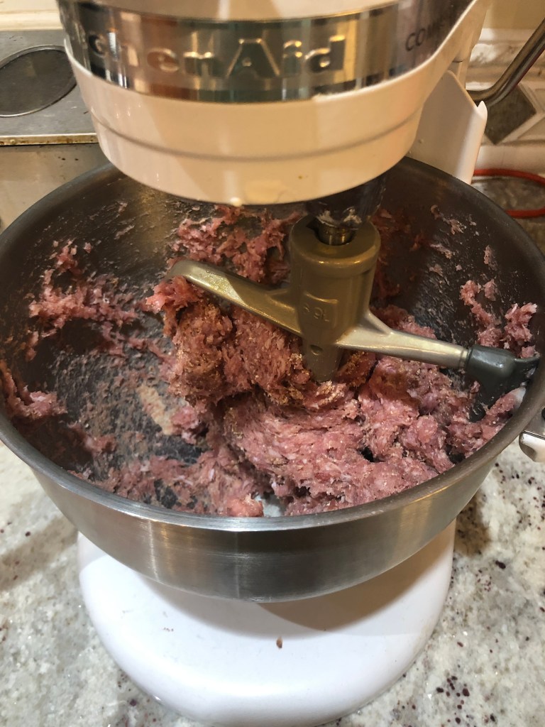 After the meat mix had finished cooling sufficiently, it was into the mixer with the wet and dry ingredients, and the casings were put into a cold water bath to soften up.
