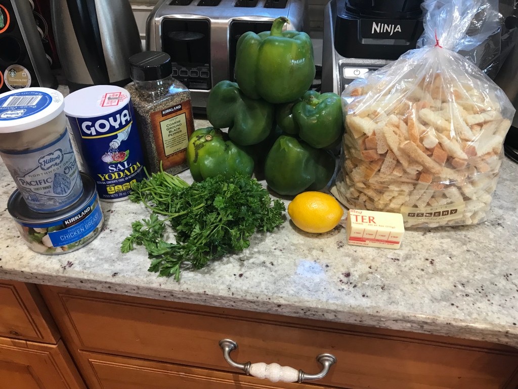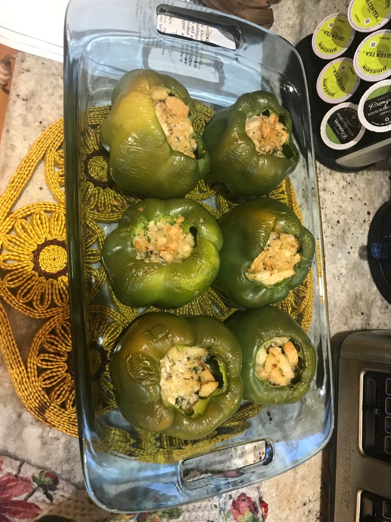 The last dish on the appetizer list is stuffed peppers, which were not a huge hit from my family but I completed the task nonetheless. After hollowing out six green peppers, I filled them with a minced chicken, breadcrumbs, parsley, butter and oyster mix, with salt, pepper, and lemon juice. Once filled, they were baked for approximately twenty minutes, and served hot.