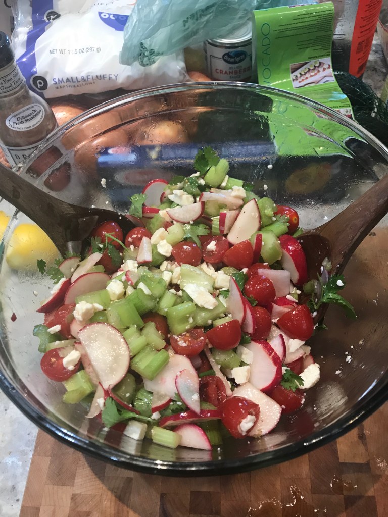 The Radish Salad is the next dish on the appetizer list, being composed of radishes, tomatoes, and celery, and the dressing a simple oil and vinegar, feta, and some parsley as garnish.