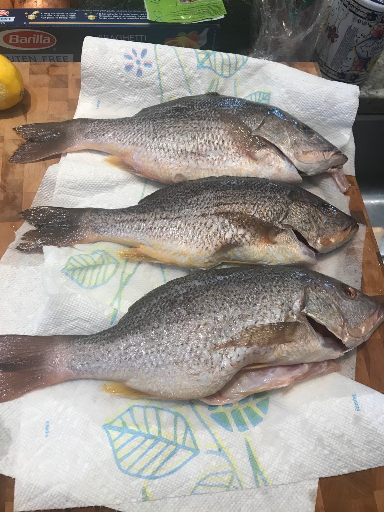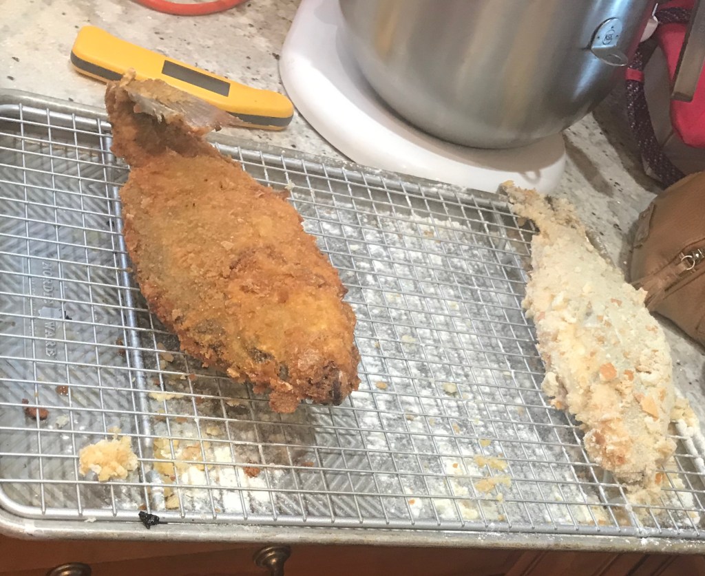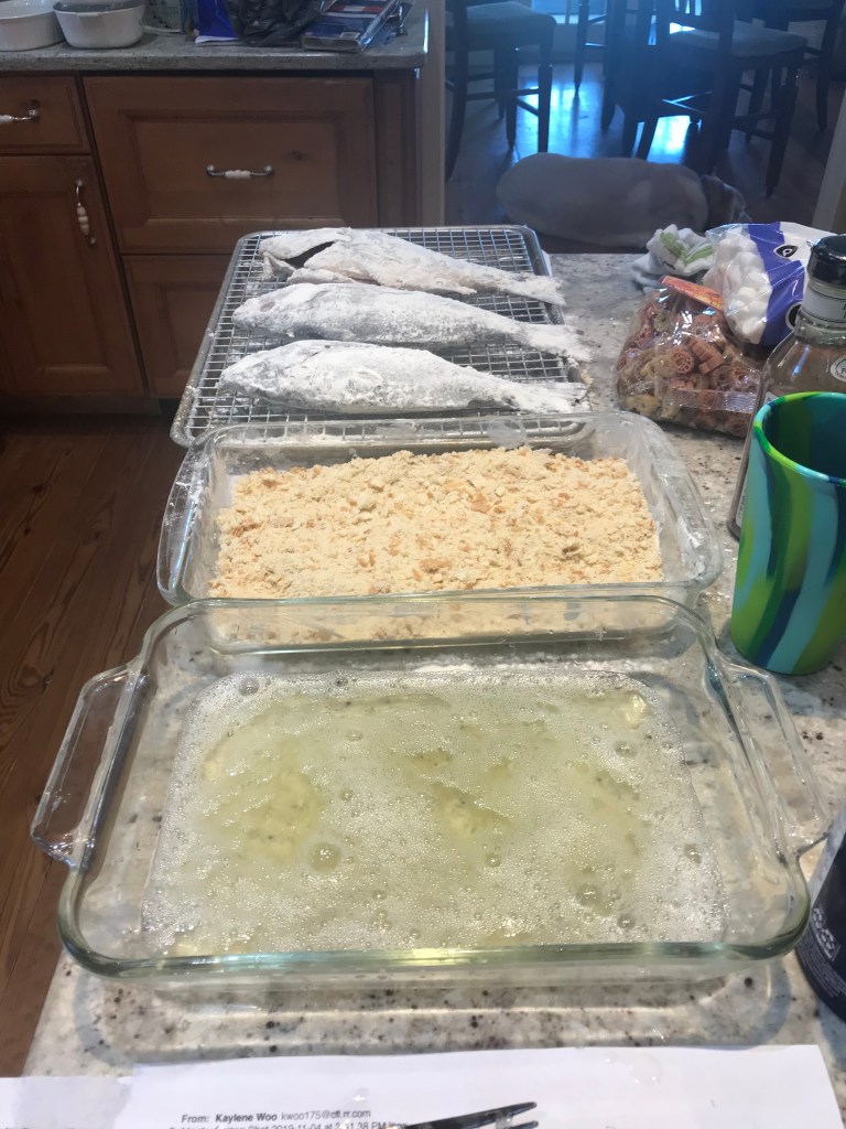 The snapper were individually dipped into salted milk then flower, then egg wash and bread crumbs. Below is a picture of the fish covered in the salted milk and flower, about to go into the egg wash and bread crumbs.